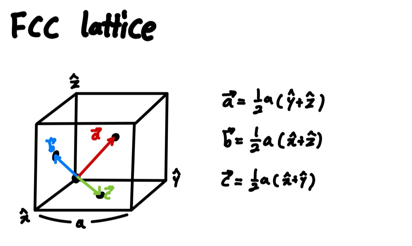 FCC의 기본격자는 각 면의 중심 지점에 하나씩 존재한다. SC와 다르게 FCC는 unit cell내에 (000), (½0½), (0½½), (½½0)에 원자가 존재하기에 이런 식으로 기본 병진 벡터를 정의할 수 있다.