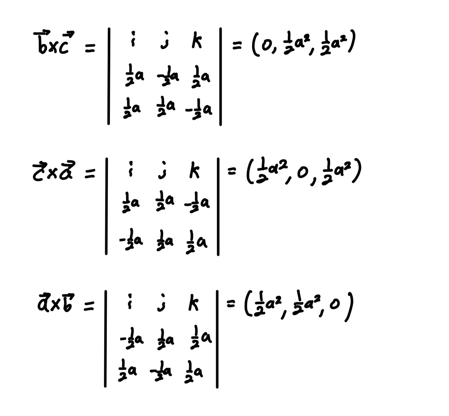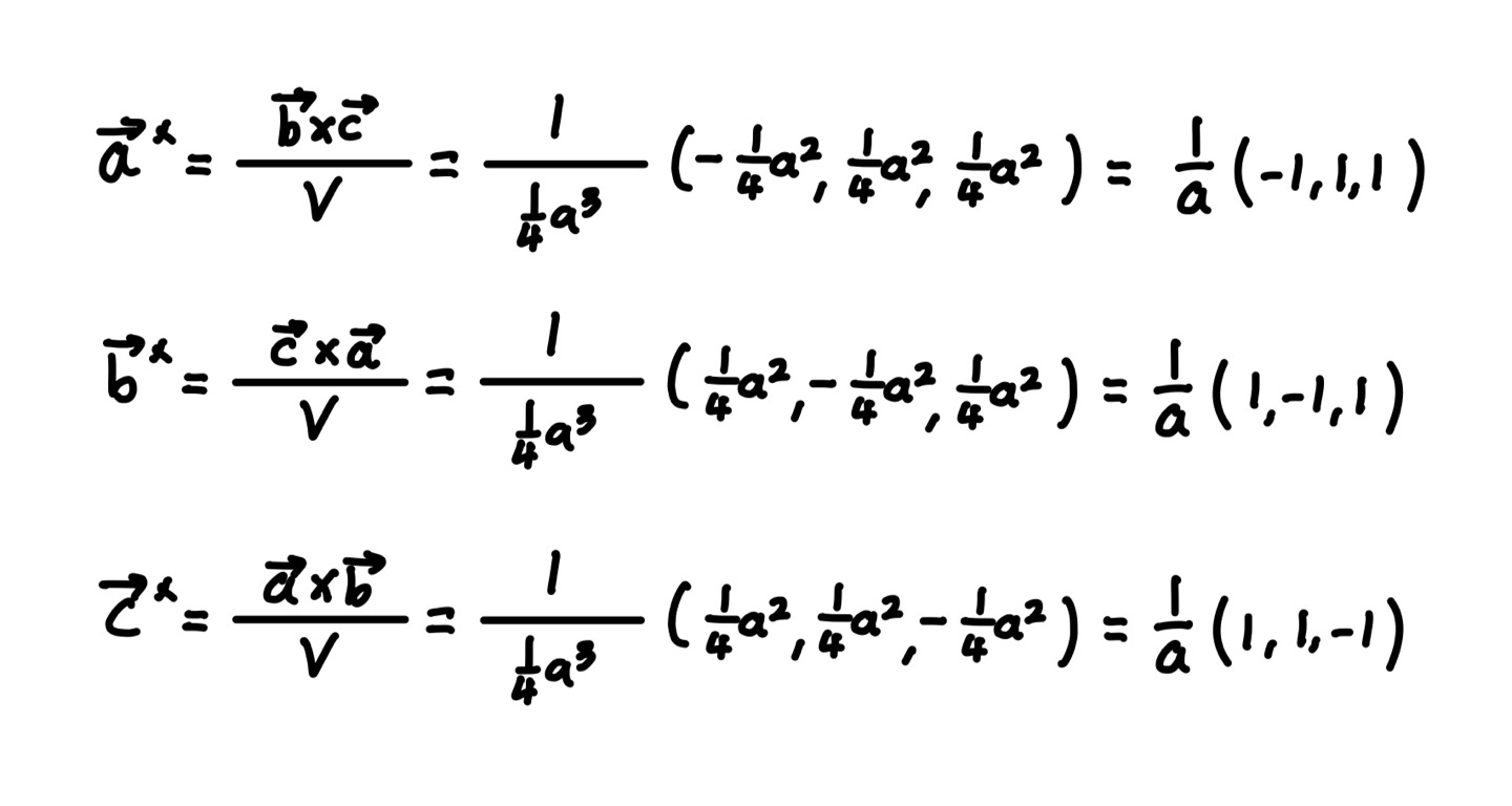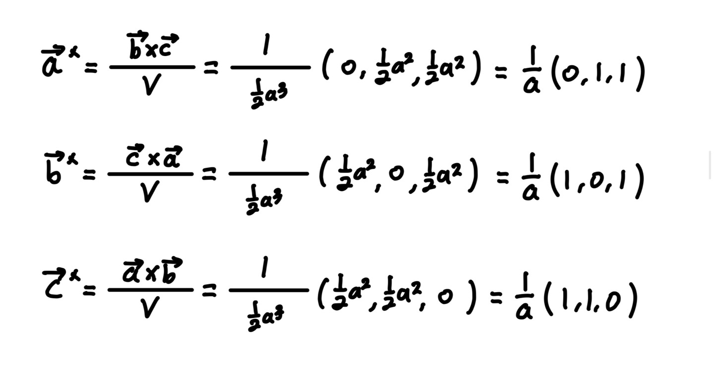 unit cell의 V를 a(b*c)의 부피 공식으로 구하게 되면 1/4a^3를 얻을 수 있고 이를 바탕으로 역격자를 계산할 수 있다.