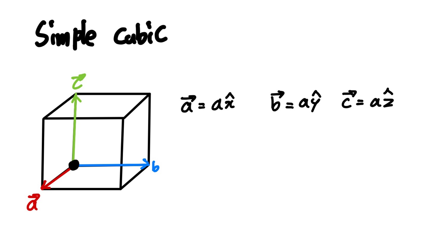 simple cubic은 기본 벡터가 직교좌표계와 유사하며 모두 서로 직교한다는 특징을 가진다. 하지만 벡터의 크기는 a이다.