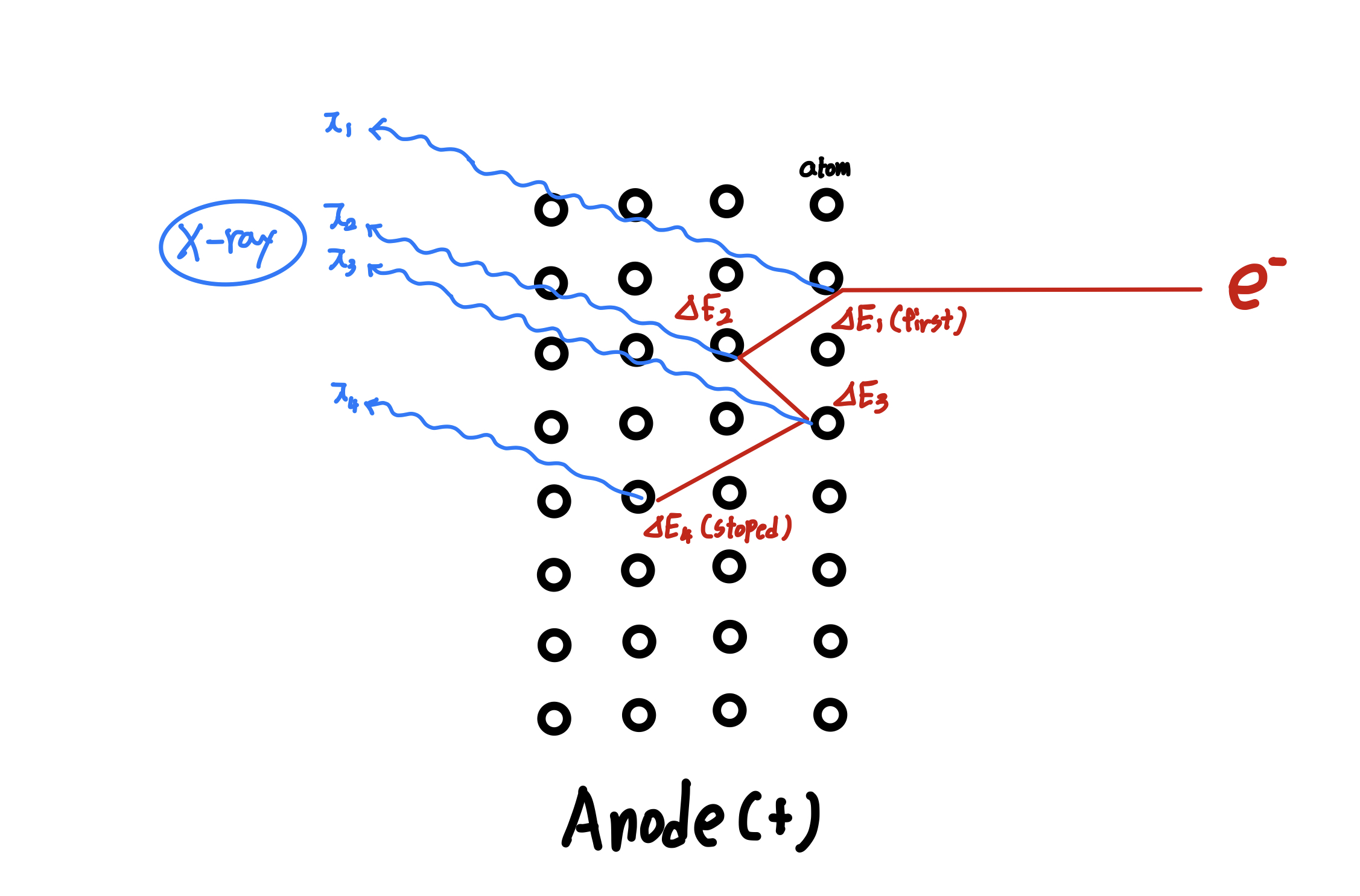 전자 1개가 양극 금속에 충돌하는 것을 상상해보자 전자는 계속 충돌하며 점차 에너지를 발산하게 되고 결국 가속력을 전부 잃어버리게 된다. 위의 그림대로 4번 충돌하는 것을 상정하고 점차 충돌해가며 발산하는 에너지가 계속 감소한다고 생각해보자. 전자는 충돌시마다 $\lambda_{1},\lambda_{2},\lambda_{3},\lambda_{4}$의 파장을 가지는 빛을 순서대로 발산할 것이다.