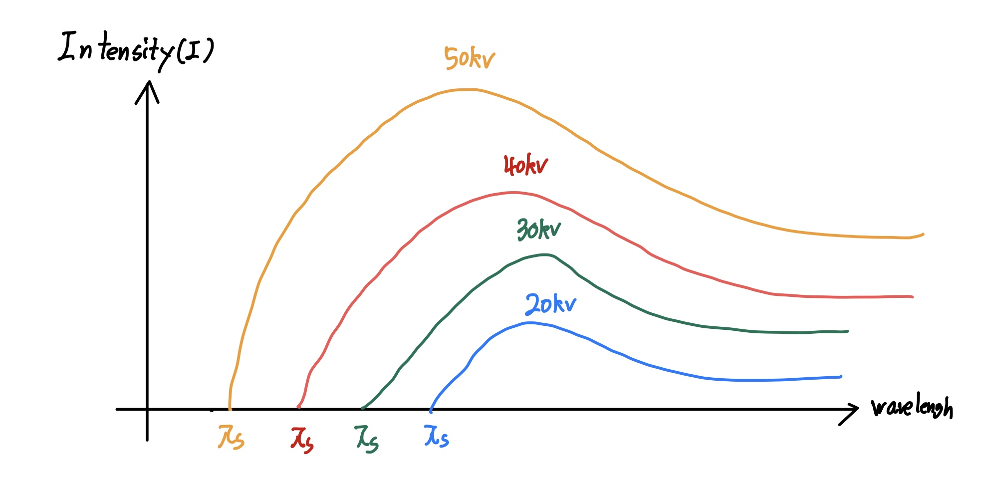$\lambda_{s}$는 가속 전압에 역비례하며 타깃원자의 종류에는 무관하다. 이보다 파장이 작은(에너지가 큰) 광자는 방출될 수 없다.