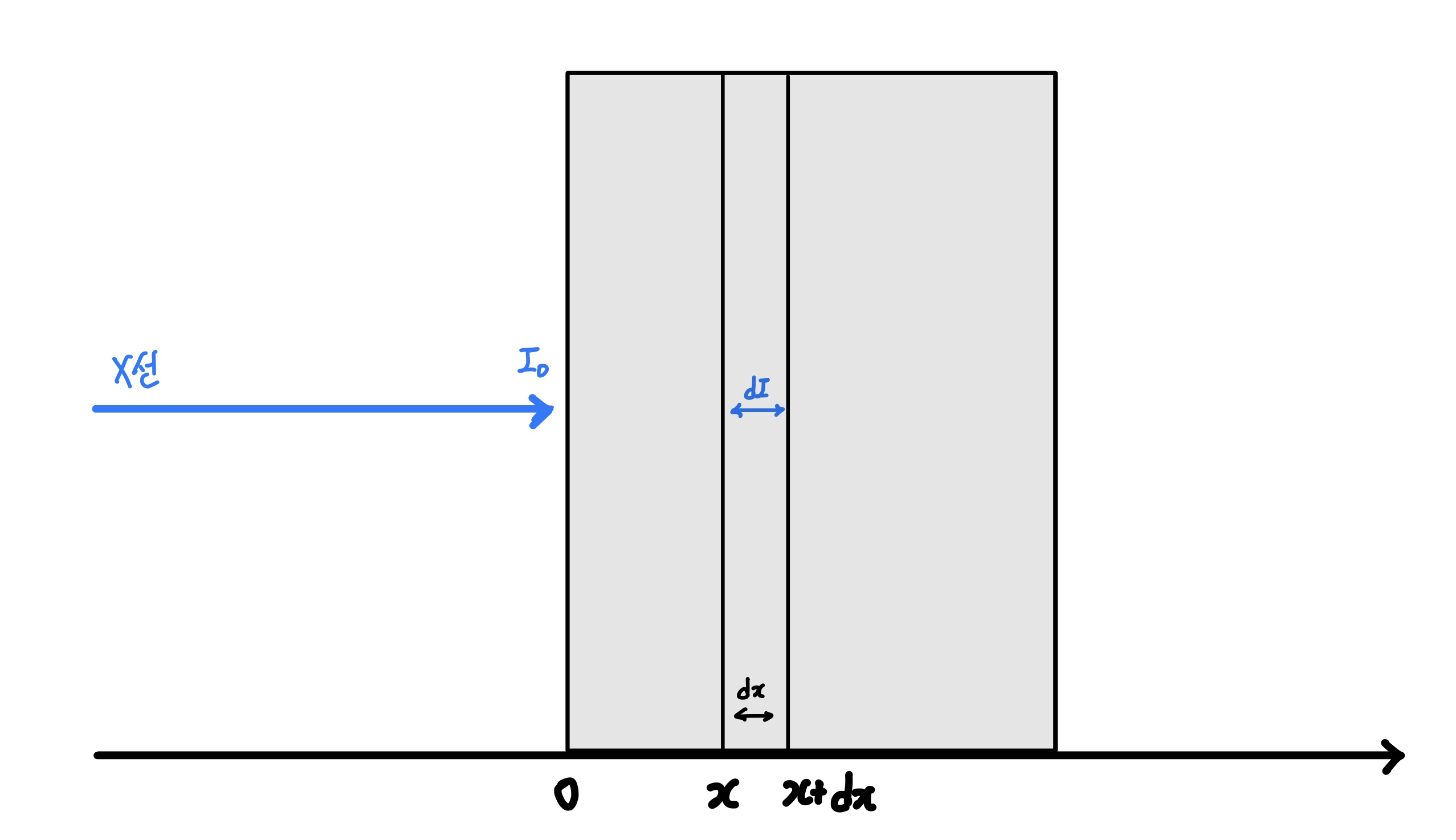 위의 그림처럼 시편 내의 한 지점인 x에서의 빛의 정도를 $I_{x}$라고 하자 (헷갈릴 수 있지만 임시로 저 지점을 x라고 이해하자) 이때 x 지점에서 X선이 극소량 dx를 이동한 지점에서 빛의 정도를 $I_{x+dx}$라고 할때, 빛이 dx만큼 이동하며 손실된 빛의 양을 dI 라고 하자.