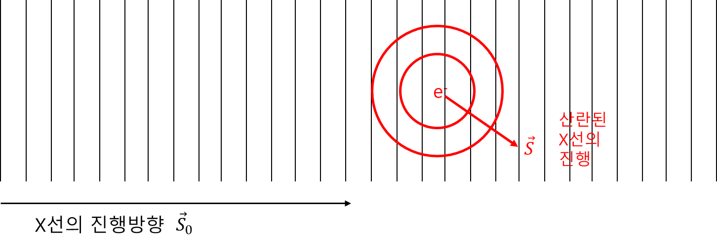 입사한 X선은 위의 그림과 같이 평면파로 입사하는데, 전자를 만나면 구면파로 퍼져나가게 된다. 이를 Thomson의 방정식으로 설명할 수 있다.