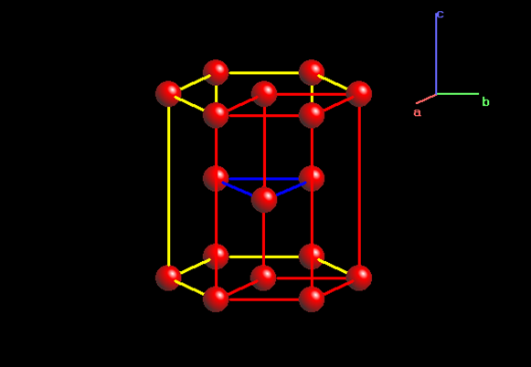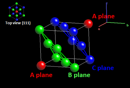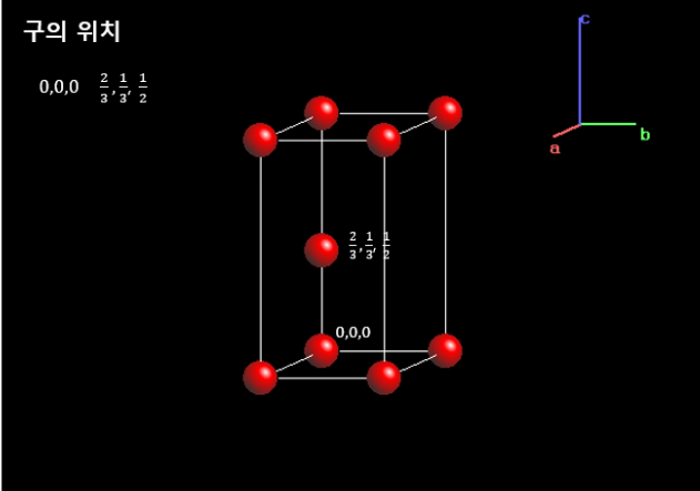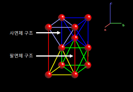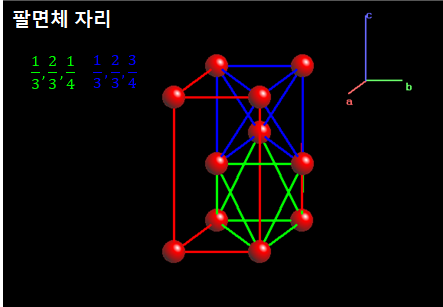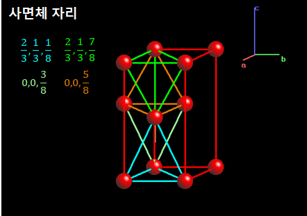 육방밀집을 이루는 원자는 단위포 내에 4개의 사면체 자리와 2개의 팔면체 자리를 가진다. 배위다면체들은 기하학적으로 위의 그림과 같이 서로 면을 공유하며 포개져서 연결된다.