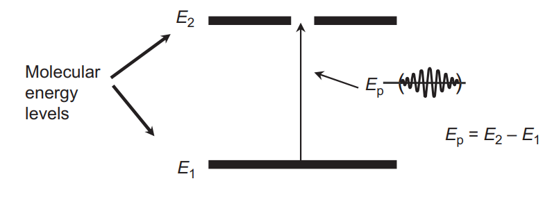 당연하게도 분자는 에너지를 받으면 에너지 준위가 높아지는데 이런 에너지는 회전하거나(Erot) 제자리에서 진동하거나(Evib), 혹은 전자 준위 레벨(Eele)에 의해 축척되고 빠른 시간 내에 다시 방출된다. 즉 분자의 전체 에너지는 위의 3가지 에너지를 합한 것과 같다.