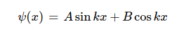 E,h,m은 상수이므로 k 치환하여 함수의 꼴을 확인하면 ψ(x)는 자기 자신을 2번 미분하면 - ψ(x)가 되는 함수이어야 한다. 이를 만족하는 함수는 대표적으로 sin(x), cos(x)가 있으므로 ψ(x) = Asinkx+Bcoskx 꼴이 된다. (ψ(x) = e^kx도 가능하지만 이는 지금은 사용하지 않는다)