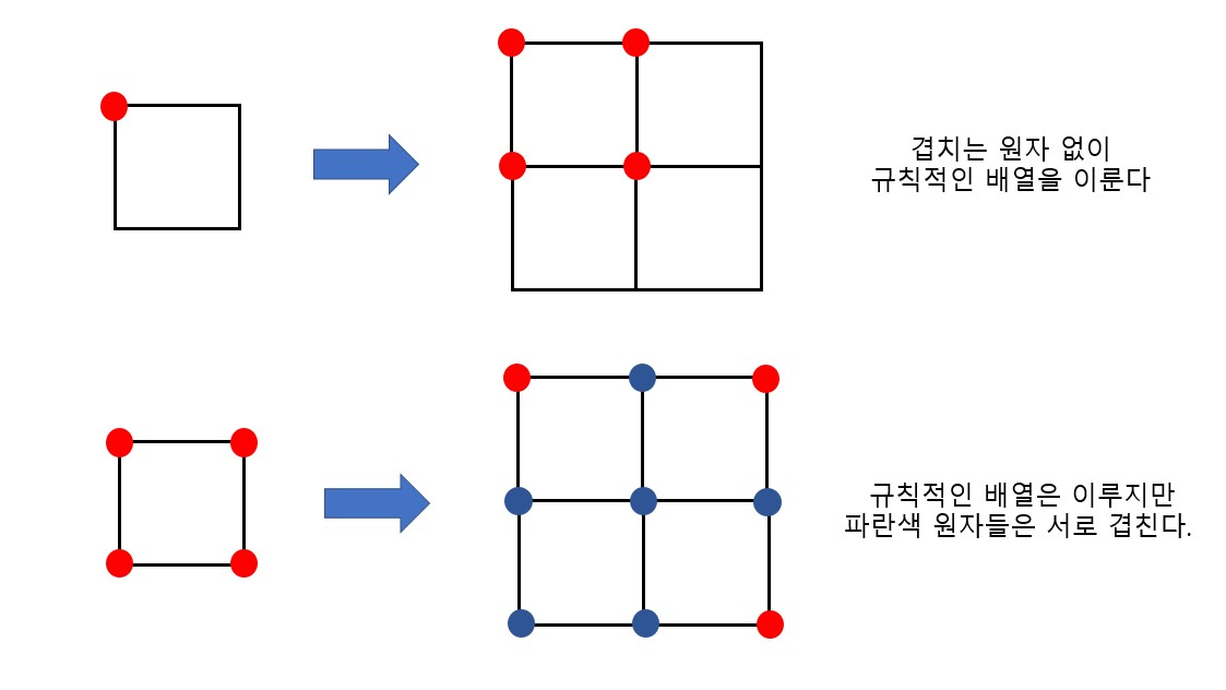 다만 주의해야 할 점이 있다. 기저의 모양이 어떤 모습이든 상관 없다고 해서 겹치는 원자가 존재해서는 안된다. 대칭성을 거스르지 않는다는 것이 이런 것을 의미하게 된다. 아래의 2번째 그림처럼 결정 전체에서 봤을때 단위포 네 변에 모두 원자가 들어간다고 기저 까지 4개의 원자를 포함하는 것은 아니다. 정사각형 단위포에서는 1개의 원자만이 기저로 존재할 수 있다. 이 1개의 원자가 평행이동을 통해 전체 결정을 형성하는 것으로 받아들여야 한다 (물론 일반적으로 단위포 4개에 원자를 다 집어넣긴 하지만 이건 이해를 쉽게 하기 위함이다)