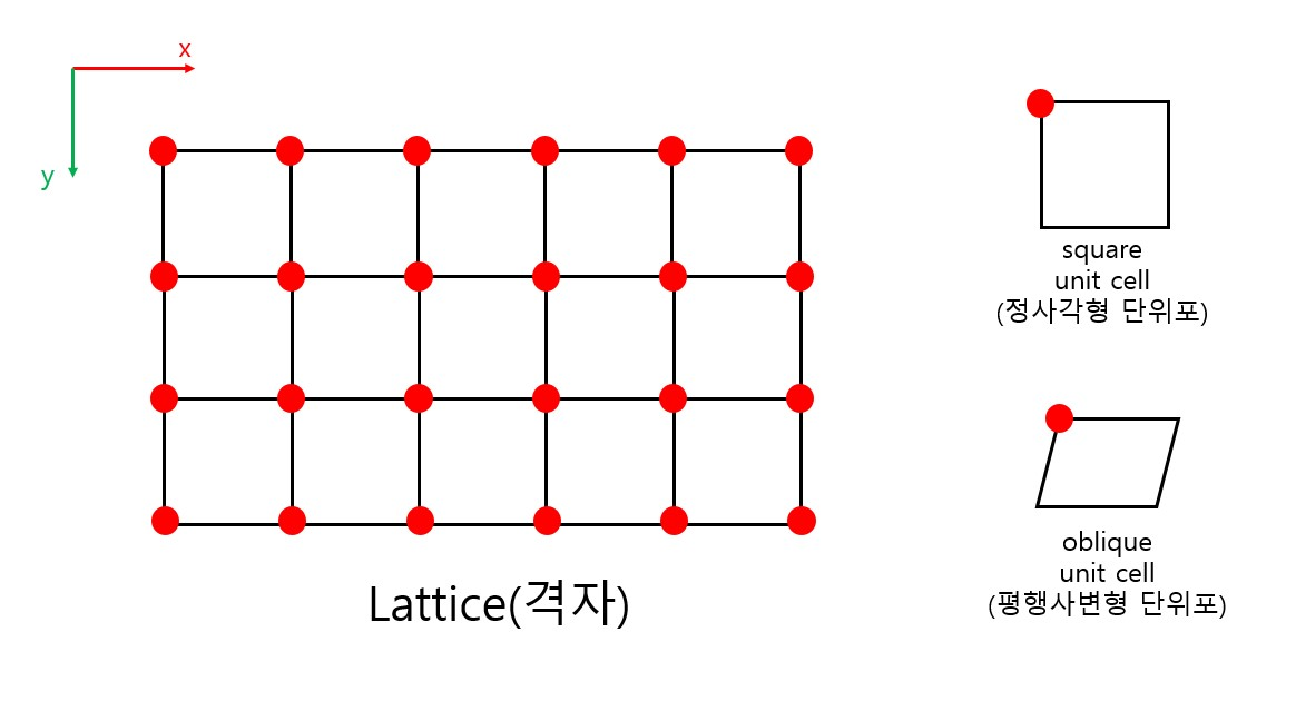 그래서 우리는 원자들의 배열에서 가장 작은 단위를 설정해서 이를 규칙에 따라 대칭이동 시키는 방식으로 결정 전체를 설명한다. 이때 원자의 배열에서 가장 작은 반복단위를 단위포(unit cell)이라 부르고 수많은 단위포의 규칙있는 배열을 격자(lattice)라고 한다.