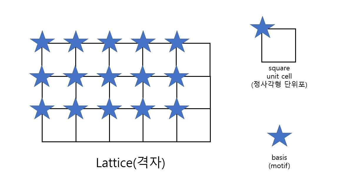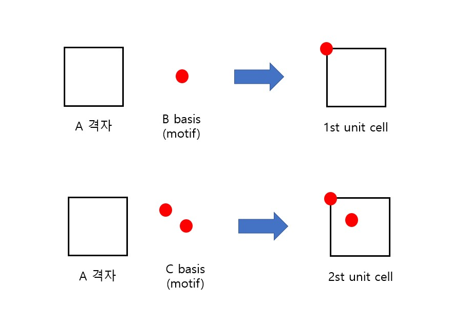 격자는 점들의 집합이므로 결정을 구성하기 위해서는 각 격자점에 어떤 요소를 주어야 한다. 앞선 설명에서는 원자를 격자점으로 대신해서 보여주었지만 격자점은 원자를 의미하는 것이 아닌 대칭의 기준이 되는 요소를 말하는 것이다. 격자를 이루기 위해서는 위의 그림처럼 단위포에 쒸워지는 기저(basis)가 필요하다. 대칭적으로는 단위포가 결정되면 basis가 어떤 모양이라도 격자는 대칭을 이룬다. 그림처럼 별모양의 모양이 있더라도 그것이 단위포의 어떤 위치에 있더라도 상관없다.