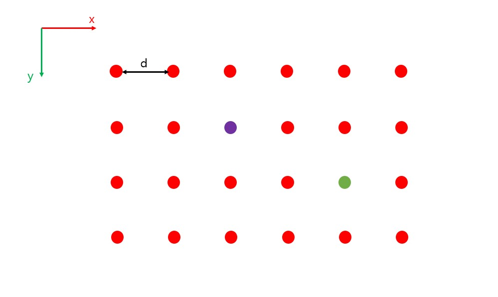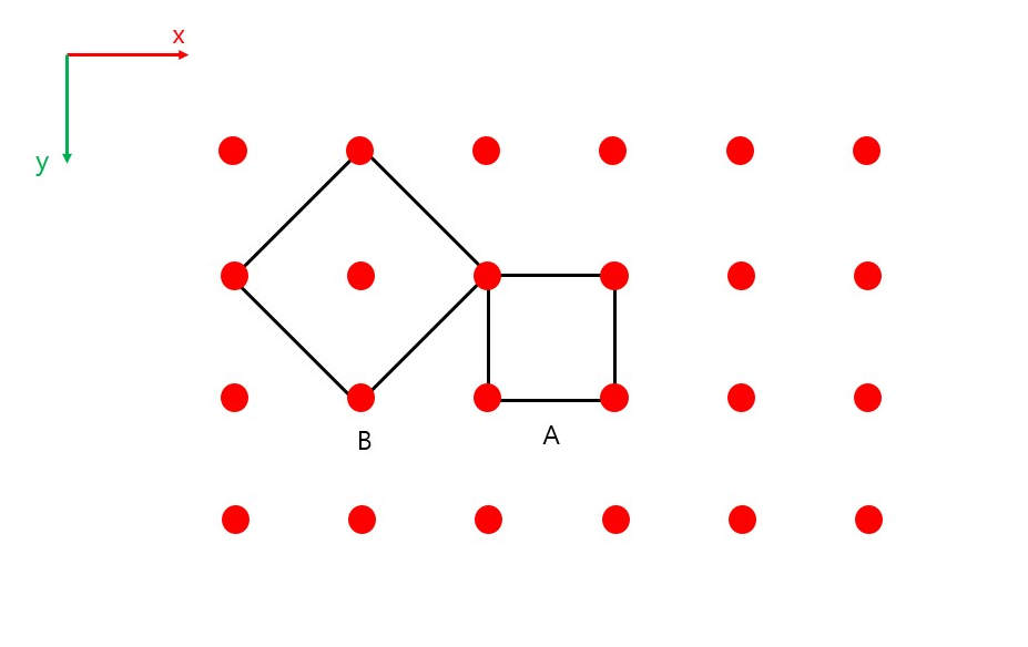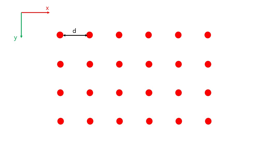 결정학에서는 격자(lattice)와 단위포(unit)이라는 개념이 가장 핵심적이며 기본이 되는 개념이다.격자와 단위포는 가장 핵심이 되는 개념인 만큼 직관적인 이해가 중요하다. 우선 2차원 평면에서 배열되어 있는 원자를 생각해보자.