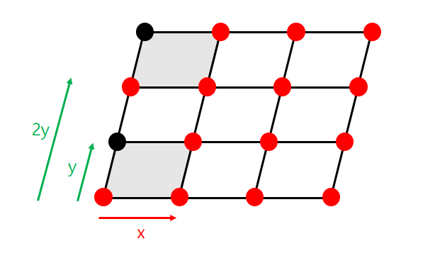 위에서 검은색 단위포는 y축 방향으로 2칸 이동했음에도 주변과 같다. 이때 x축 y축은 우리가 3차원에서 생각하는 공간이 아니라 단위포의 기저 벡터를 중심으로 생각해야 한다.