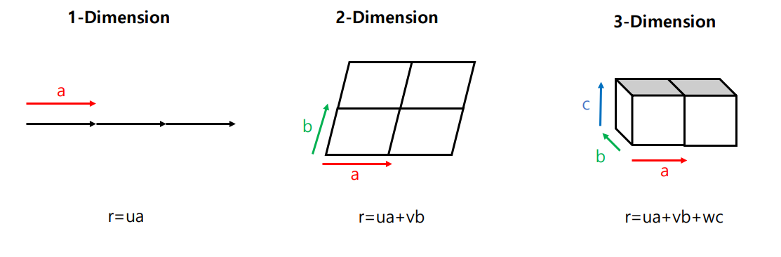 a,b,c 벡터는 격자점의 이동 방향과 크기를 나타내는 벡터중 가장 작은 크기의 벡터로 기본 격자 병진 벡터(fundamental translation vector)라고 한다. 병진벡터 r은 각 기본 격자에 정수배를 곱하고 더한 것이다.