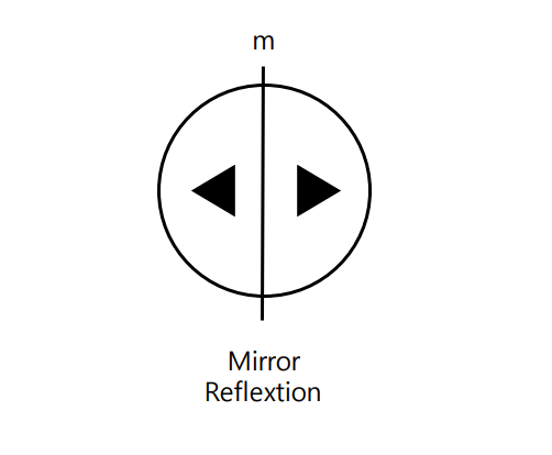 경영대칭은 어떤 면을 중심으로 면의 반대쪽 같은 거리만큼 이동시킬때 합동이 되는 대칭이다. 쉽게 생각하면 거울처럼 대칭이 되는 것이다. 그래서 표기 또한 두꺼운 검은 선과 mirror를 뜻하는 m을 표기한다. 만약 차트에서 진한 검은 선이 그어져 있다면 이건 자동적으로 mirror plane을 의미한다.