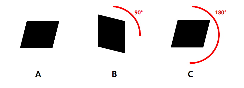위의 그림처럼 평행사변형 A가 있다고 하자, 만약 우리가 A를 블럭처럼 가지고 놀다가 돌린다고 생각해보자. A를 90도 돌리면 B와 같이 되고 180도 돌리면 C와 같이 된다. 하지만 우리가 A를 180도 돌렸음에도 불구하고 C는 A와 완전히 똑같이 생겼다. 다른 사람이 지나가다 A와 C를 보면 어떤 것이 돌린것인지 구별이 불가능하다. 이것이 대칭의 정의인 변환에 대한 불변이다.