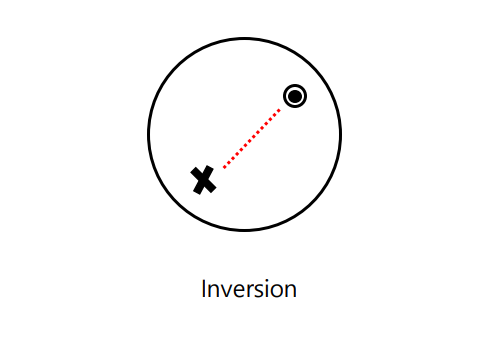위의 그림에서 한 점은 구의 표면에 있고 경영대칭 된 점은 원점을 지나 반대편 원에 있다. 반영대칭은 회전 대칭축을 중심으로 180도 회전 후 회전 대칭구에 수직인 면으로 경영대칭을 한 것과 같다. 그래서 반영대칭은 회전대칭+경영대칭으로도 이해할 수 있다.