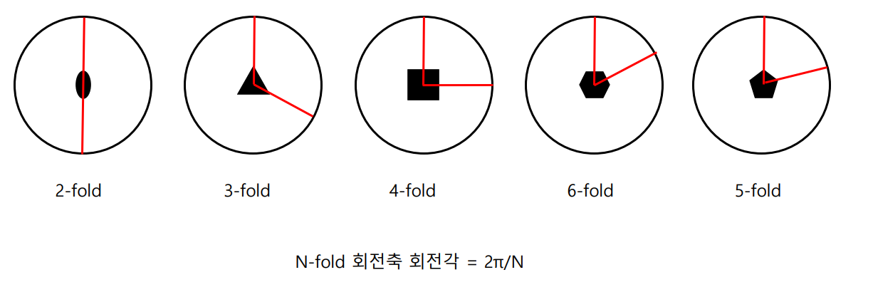4-fold 회전은 4번 회전하기에 (360/4=90) 회전각은 90도가 된다. 마찬가지로 N-fold 회전축에서 회전각은 360/N이 된다.