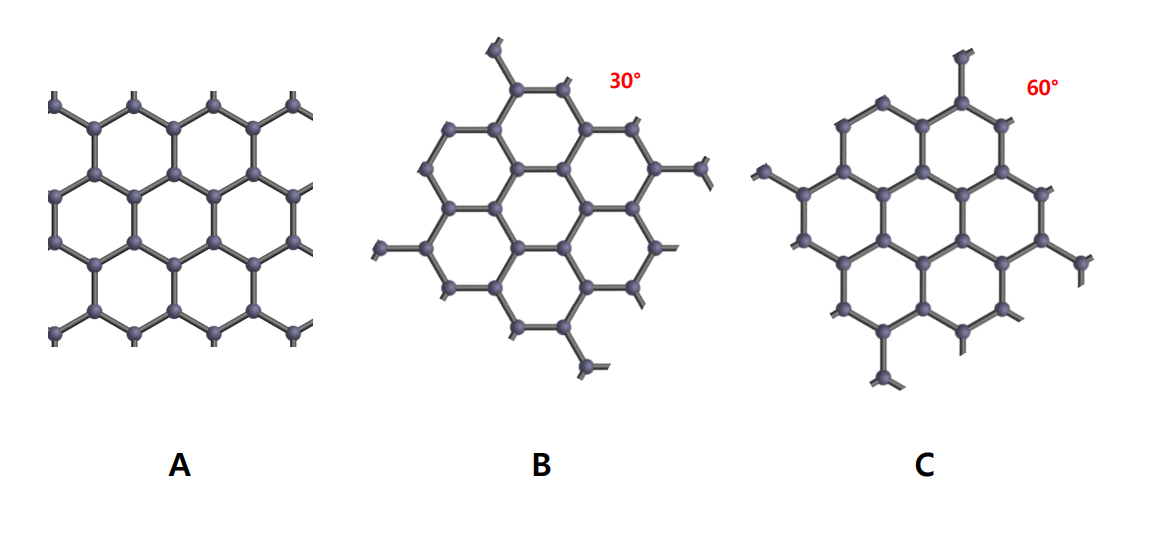 위의 개념을 실제 물질에 대입해서 생각해보면 위의 그림과 같다. 그래핀을 위에서 본 그림을 A라고 하고 30도, 60도로 회전 이동시킨 것을 B, C라고 하자. A와 C는 원자가 끝없이 많이 늘어져 있다면 완전히 같은 그림이 된다. 결국 고개를 얼마나 돌리냐에 따라 보이는것은 똑같다고 할 수 있는 것이다. 이때 여기서 사용한 어떤 작동(operation)은 임의로 설정한 축에 대한 회전이지만 작동은 회전뿐만이 아닌 다른 어느 것도 될 수 있다.